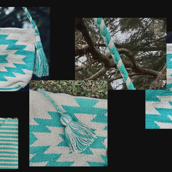 Step out in vibrant, eco-conscious style with this lightweight and comfortable, handmade woven sling bag. Expertly crafted from soft yet resilient cotton, its best-in-class turquoise and white geometric pattern offers a uniquely eye-catching aesthetic. Designed for the modern individual, this practical crossbody is also washable, ensuring effortless care – simply hand wash to keep it looking its best, ready for your next adventure. The playful tassels add a touch of bohemian charm to this consciously created accessory. Choose this distinctive and eco-friendly cotton bag for a blend of exceptional design and everyday usability that you can enjoy, wash after wash.