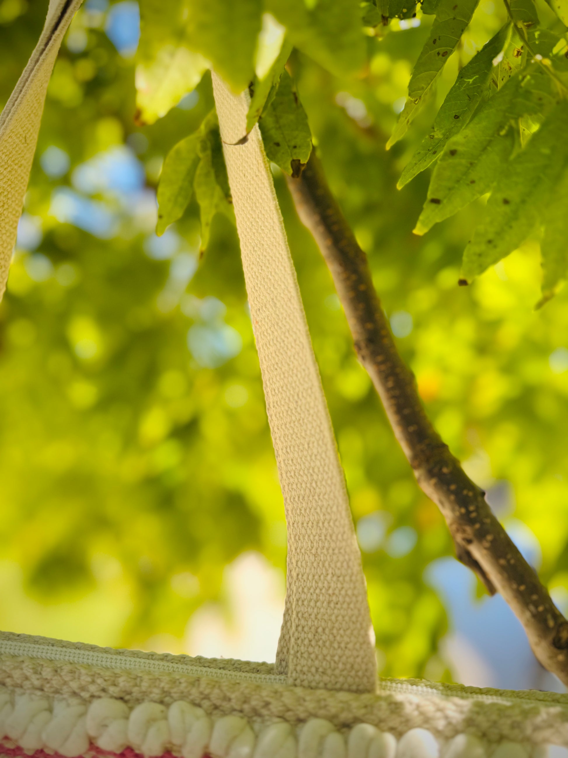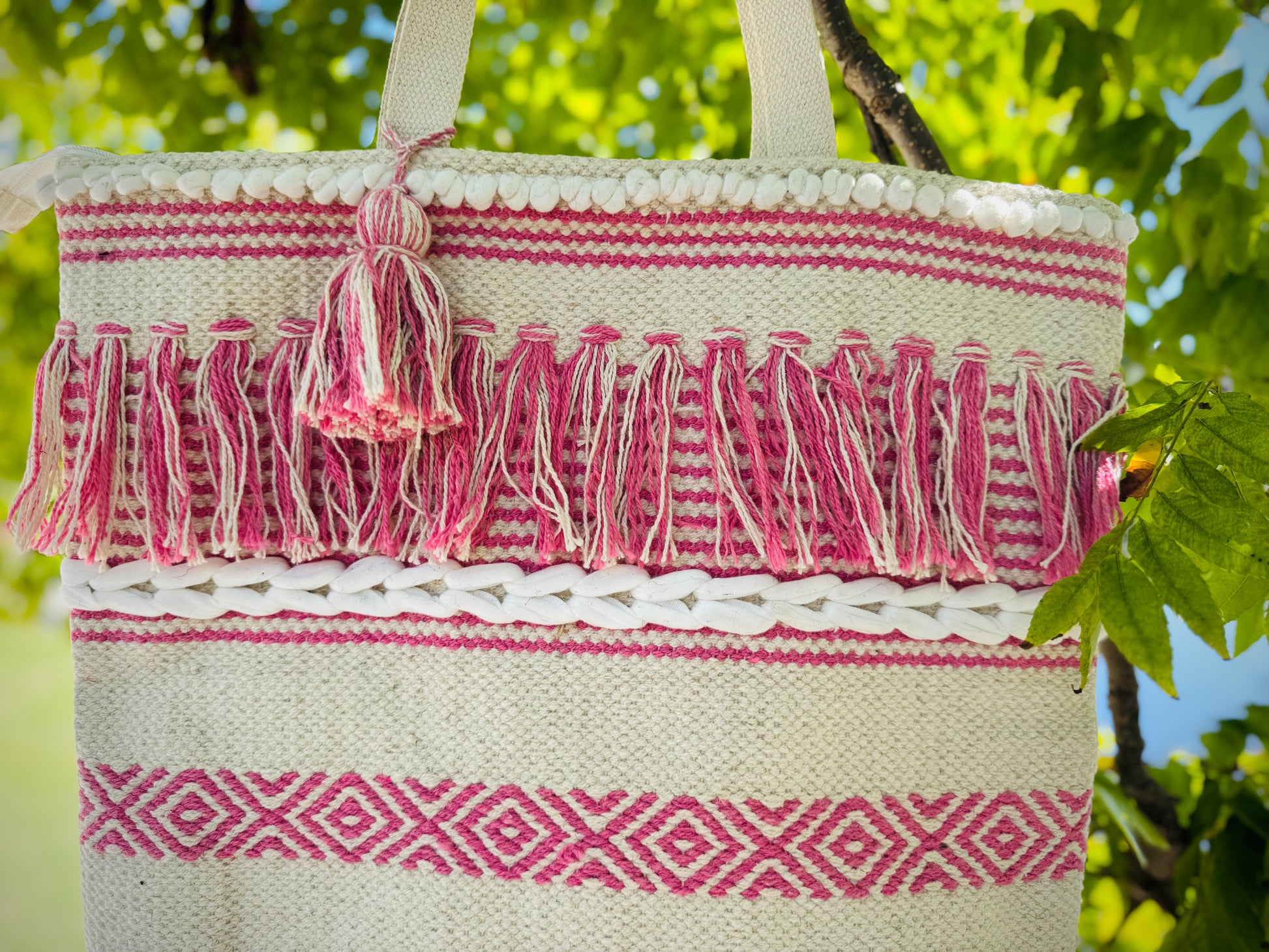 Choose a bag that's kind to the planet, gentle on your shoulders, and a joy to behold. This eco-friendly, handmade cotton tote in its cheerful pink and white is more than just an accessory – it's a conscious choice for style and sustainability.