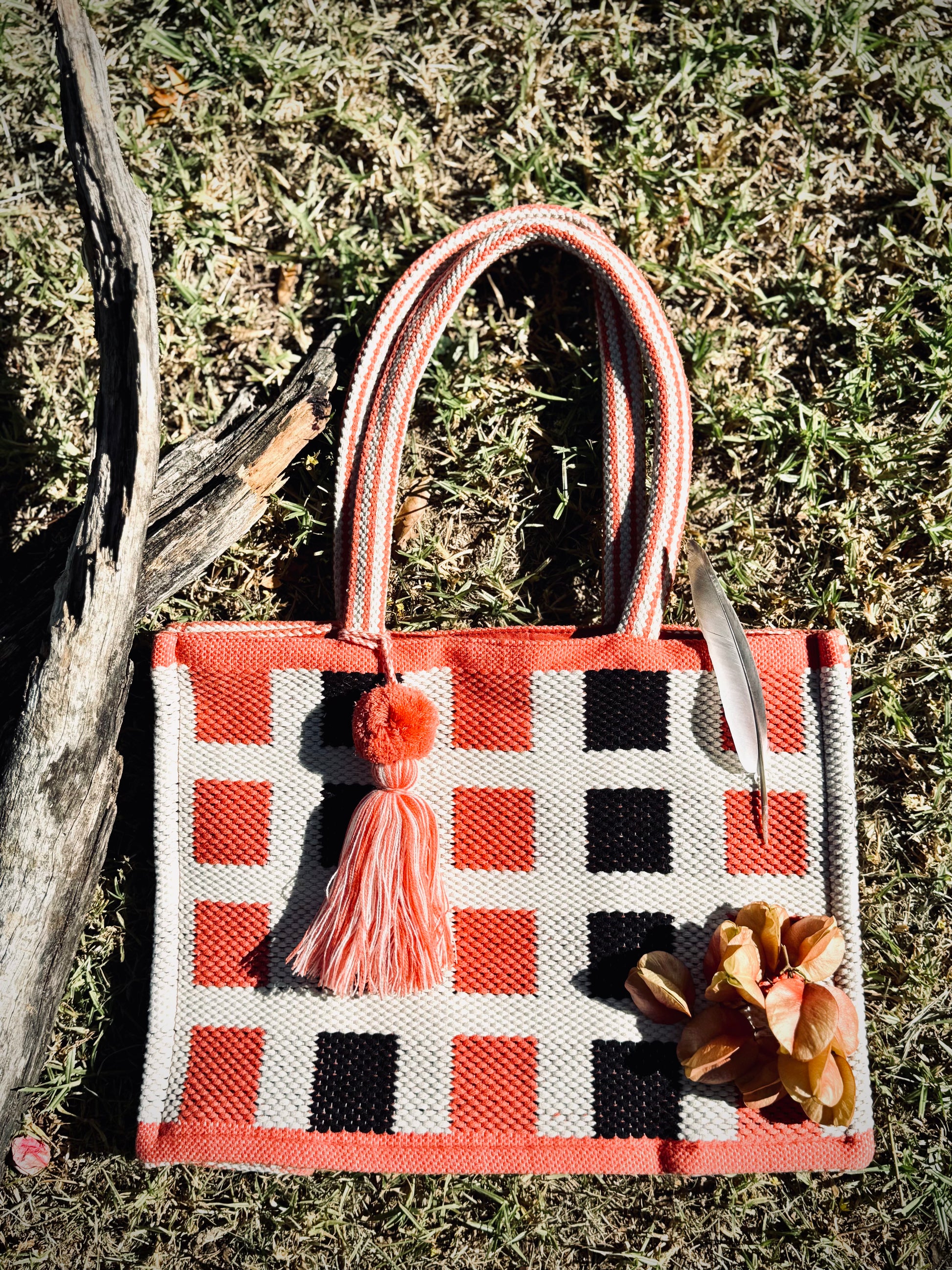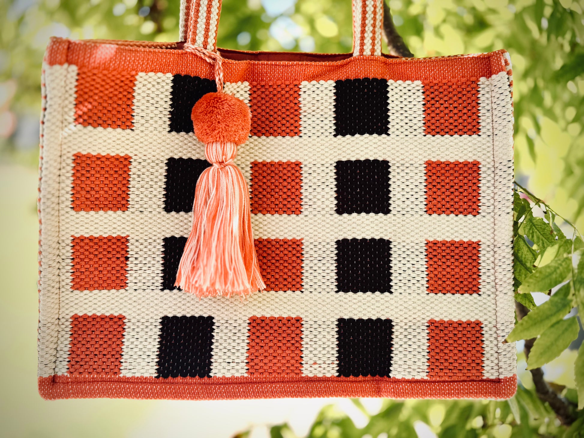 This is a best quality, handmade, and durable tote bag, meticulously woven from soft yet sturdy cotton. Its modern and eye-catching design features distinct blocks of color in vibrant orange, bold black, and fresh cream, creating a structured, rectangular shape. Designed for longer use, this bag is also conveniently washable, making it both stylish and practical for everyday life. A playful tassel adds a unique and charming finishing touch to its overall aesthetic. For ease and security, the bag features a convenient magnetic closure to keep your belongings safe and accessible.